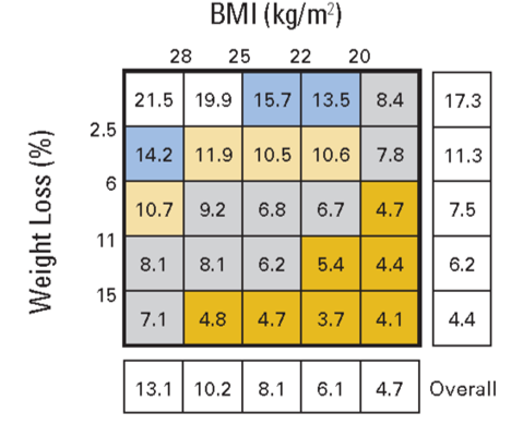 更深层的分析揭示,生存获益与体重增幅紧密关联,体重每增加1%,死亡风险约降低8%。